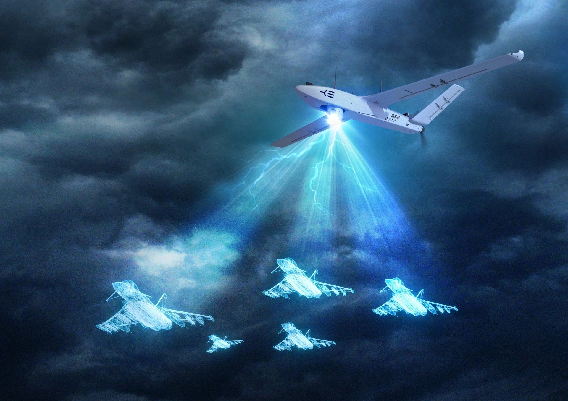 A concept of the RAF’s new StormShroud drone (Tekever AR3) emitting electromagnetic “beams” to blind and deceive enemy radars, shielding friendly fighters.
